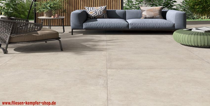 Die Terrassenfliese Industries ist die ideale, widerstandsfährige Feinsteinzeugfliese für den Außenbereich. Die natürliche Oberfläche in Betonptik passt sich ideal an die Natur an.