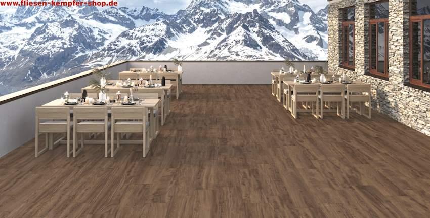 Die Terrassenfliese Rustical ist die ideale, widerstandsfährige Feinsteinzeugfliese für den Außenbereich. Die natürliche Oberfläche in Holzoptik passt sich ideal an die Natur an.